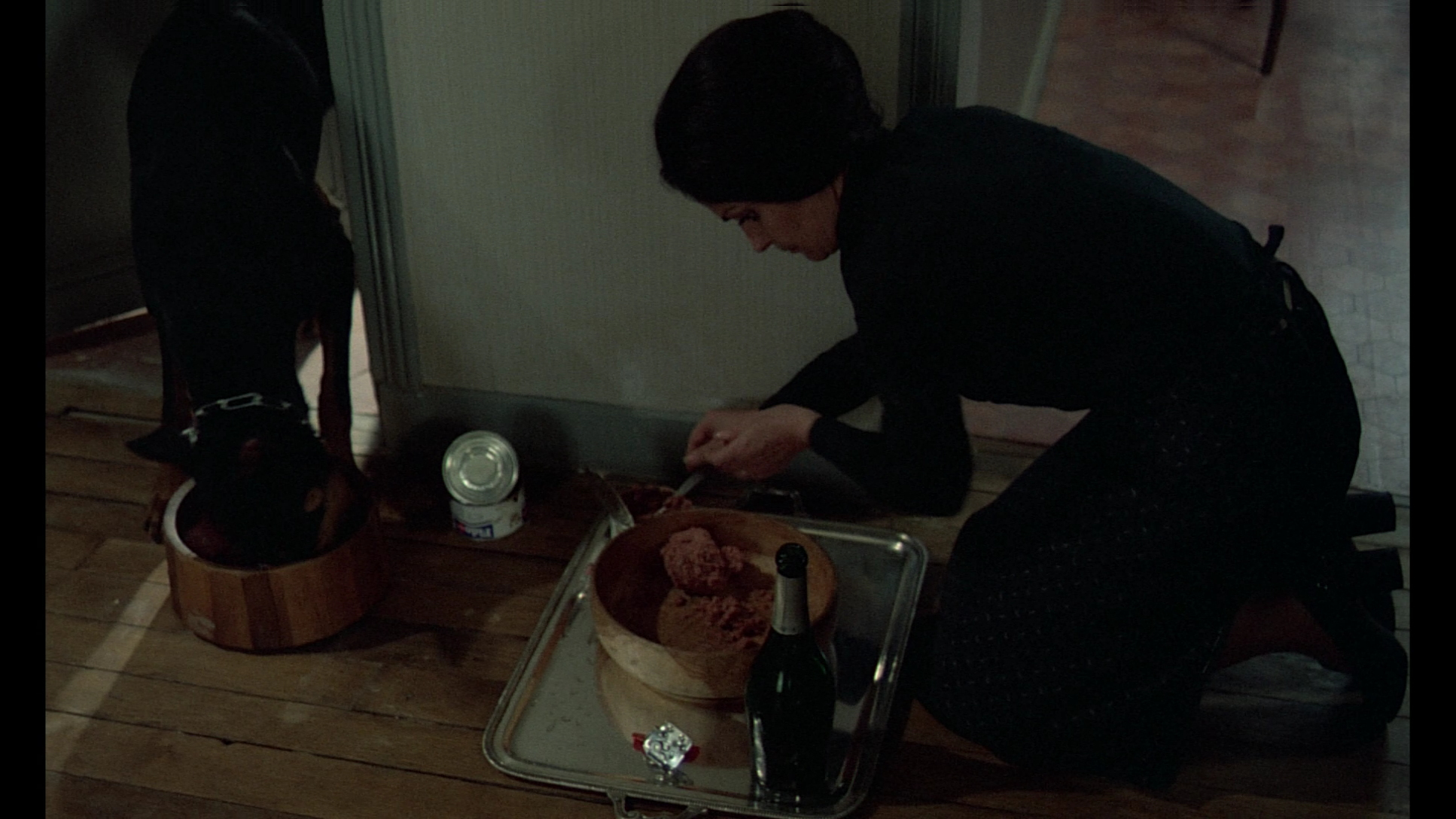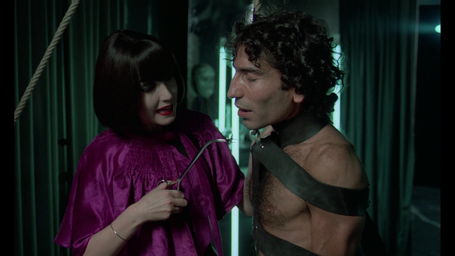 On the other hand, the BFI revisited this volatile film in 2012 for a dual-format release containing a Blu-ray and DVD, both from a new HD transfer. It's quite a beauty, maintaining the usual perfect 1.66:1 framing and conveying the sleek, dark compositions with beautiful clarity. The colors are beautifully intense when they should be, especially the jolting violet of Ariane's cloak and the steely cold blues of her chic work chamber. The optional English subtitles appear to be the same as the prior release but are much more reasonably sized, and the PCM French mono track sounds great but really only has basic dialogue and occasional sound effects to handle. The main video extra on the BFI release is "Domestic Masochism," a new HD 28-minute featurette with goth scholar Dr. Patricia MacCormack and PhD candidate Edward Lamberti go into detail about the film's censorship history, the odd relationship of sadism to masochism in film, and some of the more pivotal scenes and how they reflect on real-life practitioners. Some of the observations are actually quite fascinating, and it's a good breakdown of a film that might seem baffling to some unprepared viewers. The original trailer for the film is also included along with bonus trailers for Schroeder's More and The Valley (Obscured by Clouds).