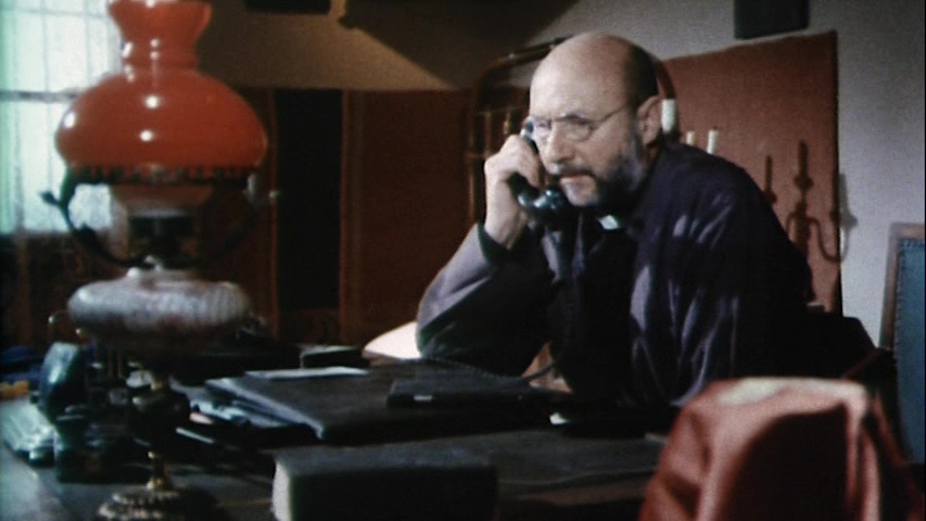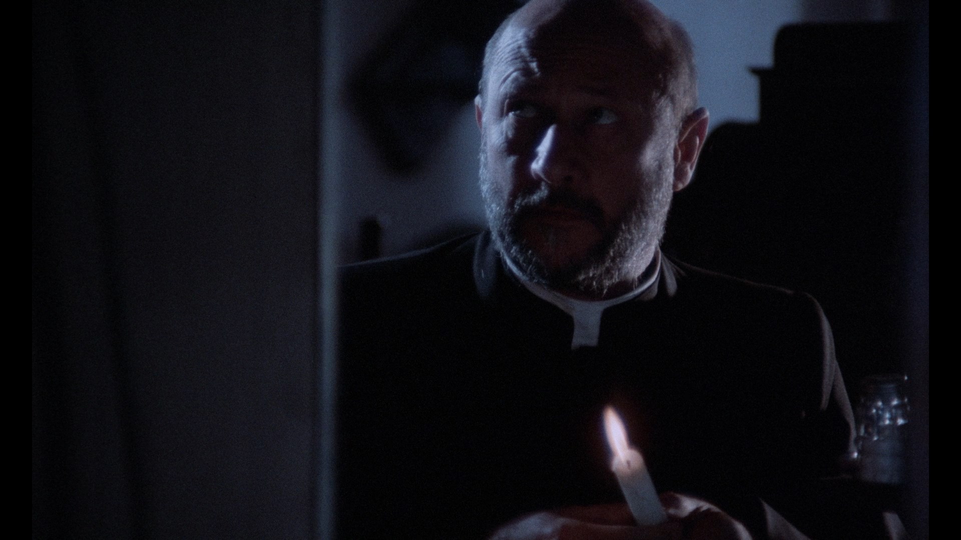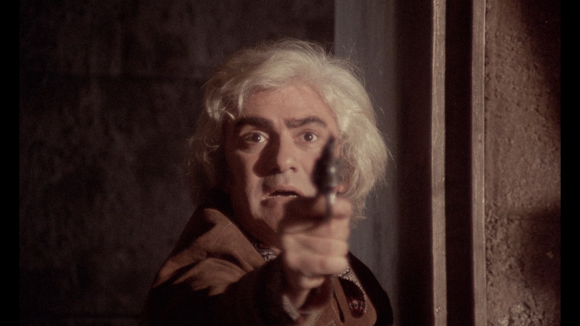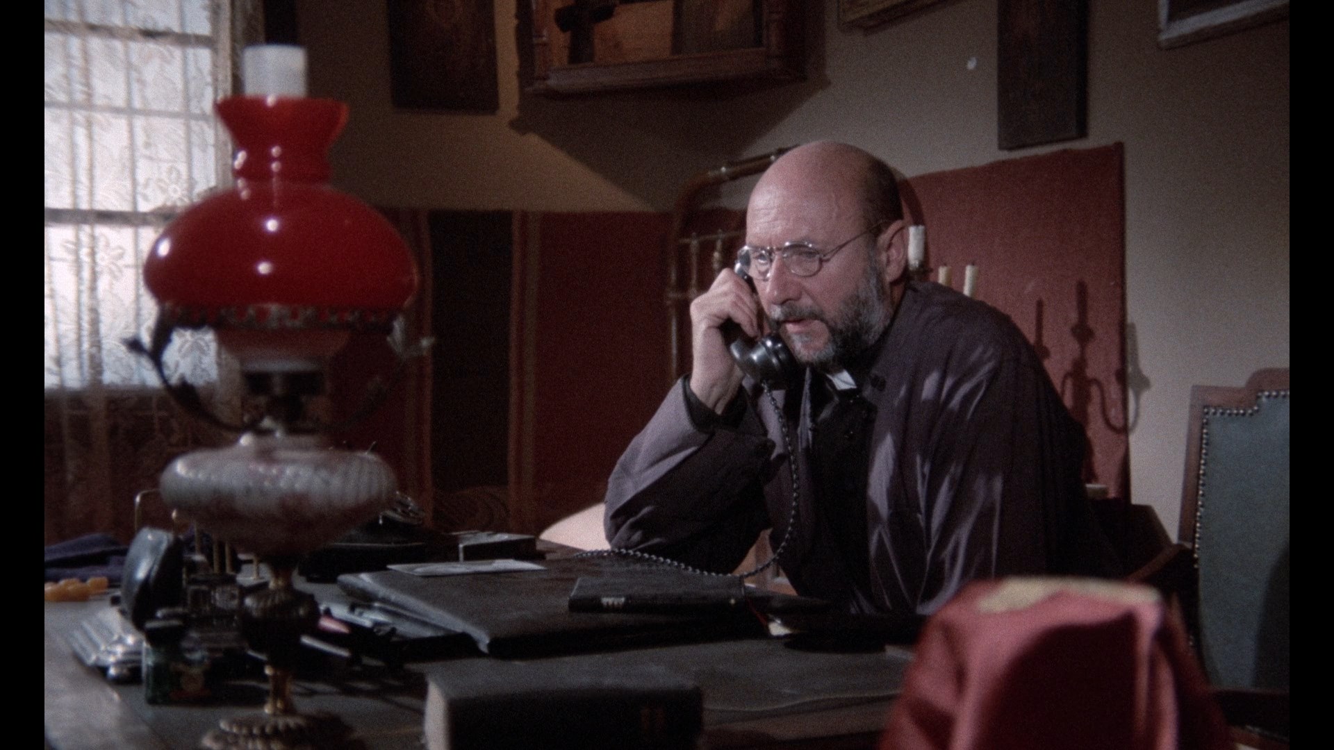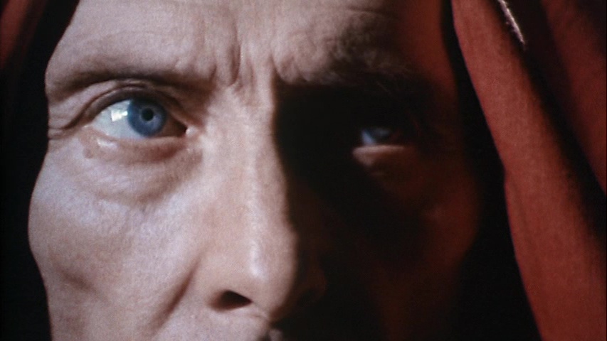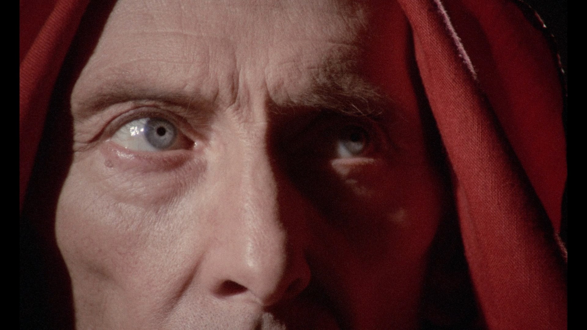 sounds a lot better, too, with a solid DTS-HD MA English 1.0 track (with optional English SDH subtitles). A very informative and sometimes quite amusing new audio commentary by critics and authors David Flint and Adrian J. Smith goes a thorough job of covering the film including its odd financing (a combination of U.S. money and, believe it or not, the famous Getty family in America), the state of international horror filmmaking at the time, the release history and alternate versions, the careers of Pleasence (including his odd Irish accent) and Cushing whose roles were originally supposed to be swapped, the joys of watching Cushing brandish a shotgun, and more. Also playable with the film is "The John Player Lecture with Peter Cushing," a 92-minute audio recording of a discussion with the actor and David Castell at London's National Film Theatre. It's very witty and packed with stories of his career starting with his early inspiration from Tom Mix movies through his progression to becoming a performer on the big and small screens in Great Britain including Hammer and beyond, as well as sojourns with Hollywood stars. In "This Life and the Next" (7m48s), producer Frixos Constantine looks back at the film including director Costas Karagiannis, the script, the decision to hire Eno, and the cast (some of whom were more pleasant than others); his accent is very thick which makes a few bits hard to make out, but it's worth a listen. Also included is the sanitized Super 8 version (93m20s) which still runs a lot longer than the American one, plus a Land of the Minotaur TV spot and trailer promoting this as "the most terrifying film of 1977" (which will come as a surprise to The Hills Have Eyes, Suspiria, Rabid, Shock, Rituals...). Finally the disc rounds out with a 29-image gallery of international photos and poster art (including a couple of shots not in the actual film), while the insert booklet features a new essay by Andrew Graves, an archival interview with Pleasence, highlights from the PR campaign, and critical reactions.