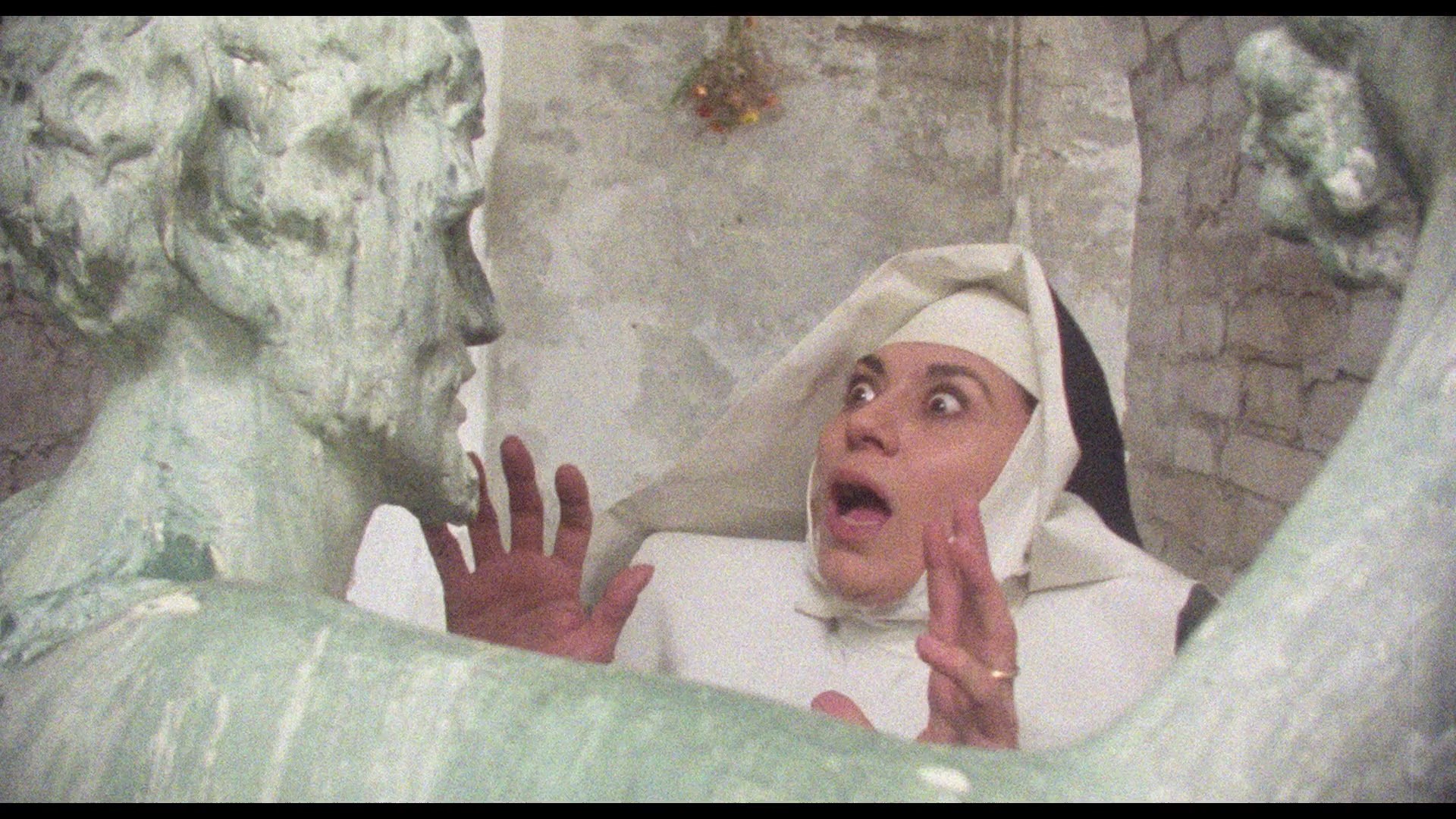 bootleg video circuit in the 1980s. Even though viewers usually had to contend with Italian dialogue and no subtitles, the mixture of evil satyr statues, forced hardcore nun sex, and rampant flesh caught the attention of viewers hungry for something a little different. Though more restrained than D'Amato's contemporary tropical XXX films of the period, this outing delivers enough illicit thrills to entice anyone with a taste for naughty sisters of the cloth. The plot, basically a rehash of the Mexican delight Satanico Pandemonium, is fairly typical for the period, with young novice Isabella (Salon Kitty's Senatore) arriving at a secluded convent and discovering that all of the sisters harbor secret lusts for the flesh, regardless of gender. Isabella turns out to be hardly innocent herself, particularly in a plot turn worthy of The Beguiled when the sisters take in a wounded lieutenant (Arquilla) who could be an emissary of Satan. Eventually a priest (spaghetti western vet O'Brien) is brought in to cleanse the convent of sin, but along the way the film makes several detours for sequences of holy sisters pleasuring themselves, being attacked by horny highwaymen, and engaging in orgies within their cloistered walls. And believe it or not, this is (very)