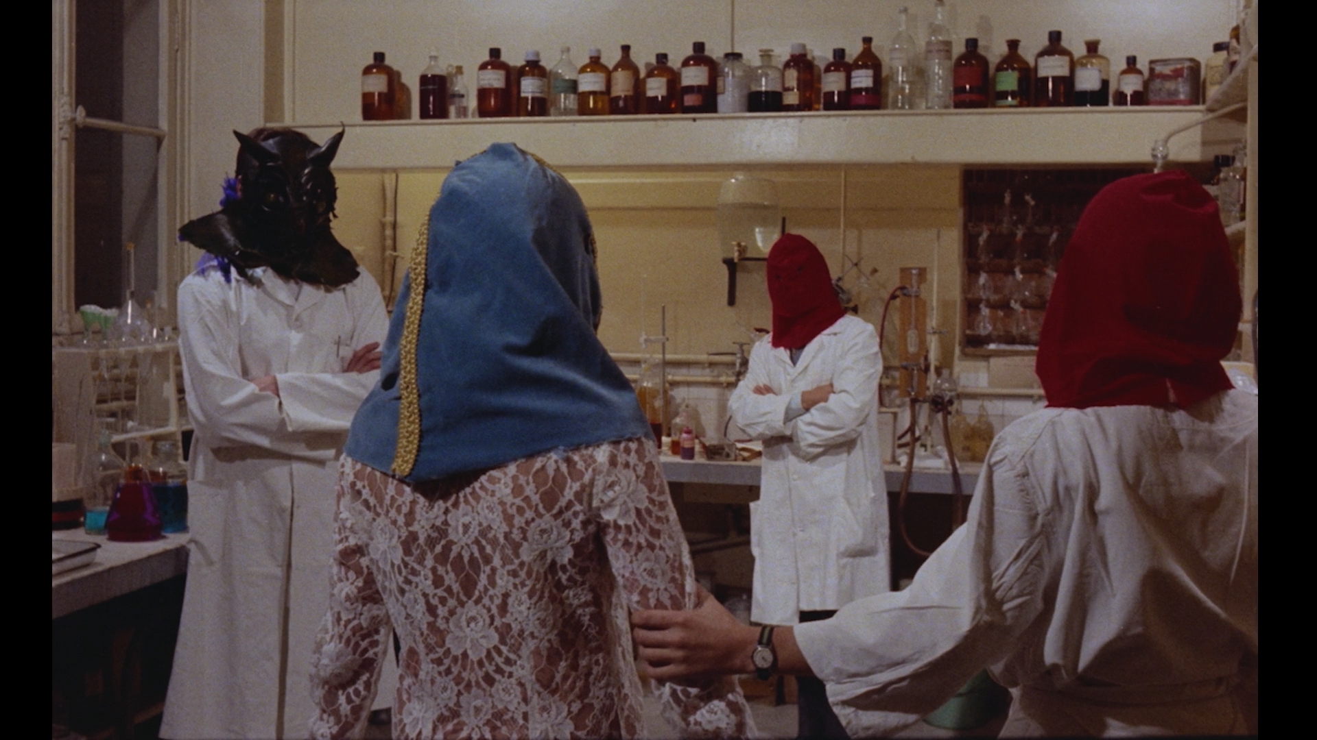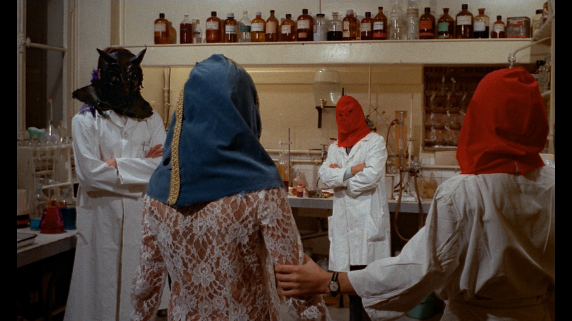 delirium of his first film, The Rape of the Vampire, director Jean Rollin returned to bloodsuckers again for a far more visually extreme variation that still stands apart from the rest of his filmography. Though his trademark obsessions with beachscapes and aesthetic nudity are still in evidence, the ultra-saturated color schemes and mad scientist motifs instead feel like some sort of unholy mash-up between Barbarella and The Diabolical Dr. Z (and almost never like a traditional horror film). The film kicks off with a group of hooded scientists doing something nefarious with their Bunsen burners and brightly-colored beakers, while others in their cult run around in animal masks and chase passing pedestrians. During all of this mayhem, young Pierre (Martin) is captivated with a scantily-clad woman (Cartier) who winds up apprehended by the sect, which turns out to be a more sinister and deadly group than they first appeared. Visitors commit suicide, blood drinking is involved, and as usual, it all winds up with haunted characters wandering a beach as their mortality comes back to bite them in the, uh, neck.