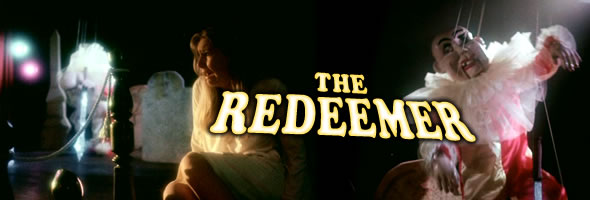 The madness kicks off in full dreamlike mode as a creepy kid rises from a lake, and you can tell he's probably evil because he has an extra thumb. Anyway, the creepy kid goes into a church where a very intense preacher (Finkbinder), the titular Redeemer, is railing against man's sinful nature. Cut to six high school friends excited about their upcoming high school reunion (apparently at a school with very, very small graduating classes): John (Knight), Cindy (Arnette, future star of the TV show Head of the Class), Terry (Carter), Jane (Barthen), Roger (Hollingsworth), and Kirsten (Patterson). Upon arrival at the deserted school, all of the exhibit what the Redeemer views as "sinful" flaws (though most people would beg to differ) including career self-interest, lust, financial greed, or lesbianism. Hardly capital offenses there, but our loony priest is off and running as he dons a different disguise for each victim, dressing up as a clown, a skull-faced reaper, or, in the most nightmarish sequence, using a creepy puppet on a stage to do his bidding. Will anyone make it through this reunion, and does the Redeemer's ultimate agenda come to light? Well, okay, that last part never does quite get answered as the film instead veers off long after its natural climax into a trippy coda that wouldn't be out of place in a Jodorowsky film. Also noteworthy is the eerie electronic music score, which occasionally recalls Libra's moody work on Mario Bava's Shock.