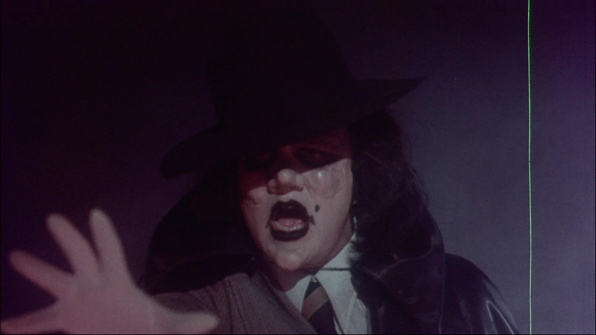 Four years later, Code Red revisited the title for a Blu-ray edition (dropping the trailer, which is no major loss) that turns out to be a little more puzzling than expected. The general appearance is similar and it's thankfully now progressive, but the framing has been slightly adjusted to 1.78:1 compared to the DVD's 1.66:1. The adjustment means a bit less information at the top and more on the bottom, with a bit extra on the sides varying from one scene to the next. The color timing also shifts significantly on two of the reels; the first now leans more to the pinkish side, while the third is darker and looks more blue compared to the DVD. For example, here's a shot from the first reel on the DVD compared to the same image from the Blu-ray seen to the left, complete with different damage marks. It's a mystery, but given the mystique already surrounding the film, perhaps that's as it should be. In any case, having The Redeemer in HD is something of an outrageous miracle in and of itself, so prepare for the glory of '70s scratchy drive-in authenticity implausibly preserved in 1080p for generations to enjoy.