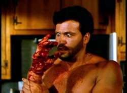 In an interesting bid at capturing viewer interest in straight-to-video obscurities that might have little customer appeal on their own, Media Blasters has kicked off a series of "Rareflix" collections highlighting weird diversions unseen since the vintage VHS days, usually dating from the mid-'80s to '90s. The Rareflix Collection 1 packs together three very different films, all of which are definitely off the radar of all but the most thorough excavator of video store arcana. Posed for Murder is essentially an American slasher variation on movies like Murderock and Too Beautiful to Die courtesy of director Brian Thomas Jones, the guy behind The Rejuvenator. Buxom Playboy Playmate Charlotte Helmkamp stars as Laura, a pinup model (of course) who's branching out into scream queen roles. Her bodybuilder boyfriend Danny decides he doesn't want all the pervs out in the audience drooling over his girl, so he goes nuts and starts hacking and slashing his way through all the men in her life, perhaps working his way up to the hunk-lunk male copy (Sgt. Kabukiman's Rick Gianasi) working on the case. Utterly trashy and oh-so-very 1989 (with that great soft, dayglo veneer more commonly found in the Shapiro-Glickenhaus canon), this is delicious cinematic swill. Up next is Death Collector, an odder genre hybrid made one year earlier, in which the America of the future has morphed into some sort of rockabilly western no man's land, with a diabolical insurance company (not called AIG, alas) rules the town of Hartford City. After being set up for his brother's murder, Wade (Daniel Chapman) pops out of prison and, with the aid of two cohorts, embarks on a quest for justice -- future style! Dark, stylish and definitely weirder than its generic VHS cover would indicate, this is one odd , an find to be sure and features a few unexpected faces like female lead Ruth Collins (who appeared in plenty of films for everyone from Roberta Findlay to Joe D'Amato) and even the once-ubiquitous splatterpunk writers Skipp & Spector! Finally it's back to psycho territory again with 1990's The Disturbance, probably the most accessible film out of the bunch. Taking a page from the splatter classic Nightmare, it's the story of disturbed, frizzy-haired Clay (Timothy Greeson in his only film role), a schizophrenic dumped out of a mental hospital who tries making a go at getting a girlfriend but finding his perception of the world around him growing more terrifying by the day as he hallucinates demons in his TV, floating eyeballs in his bathtub, and even his mom coming on to him in the shower (probably the most startling scene in the movie), with disastrous results for the family cat. Meanwhile people are dying off in his vicinity, which isn't exactly an encouraging sign. Featuring showstopping horror and gore effects by Tom Savini protege Barry Anderson (Jeepers Creepers), this one (also apparently released as What's Wrong with the Neighbor's Son?) packs in the shocks and T&A aplenty and makes for a pretty solid portrayal of mental illness as well. All three titles are presented full frame and are most likely pulled from the original masters used for their VHS releases, though obviously the leaps made in video technology mean these are at least crisper and more stable-looking than their home video ancestors. You get a few trailers with each disc, but the coolest extra is an Easter Egg commentary for each one, accessible either by clicking on the "Rare" logo in the menu or just switching audio on the fly with your remote. At least two of them were recorded on the same night and feature some audible beer consumption, which is probably a good idea for viewers trying to tackle more than one in a day, too. The commentators here are Media Blasters personnel William Hellfire, Richard York and Dave Beinlich, who generally stick on-topic to the films at hand while rattling off frequently surprising credits for everyone involved. It's also hilarious, too, with perhaps the highlight being Helmkamp's assets described as "full and life-giving."