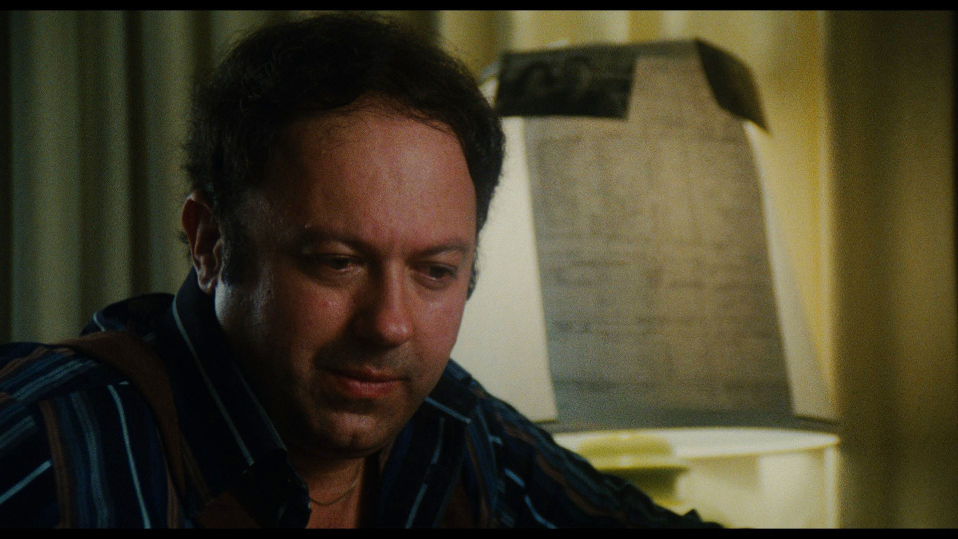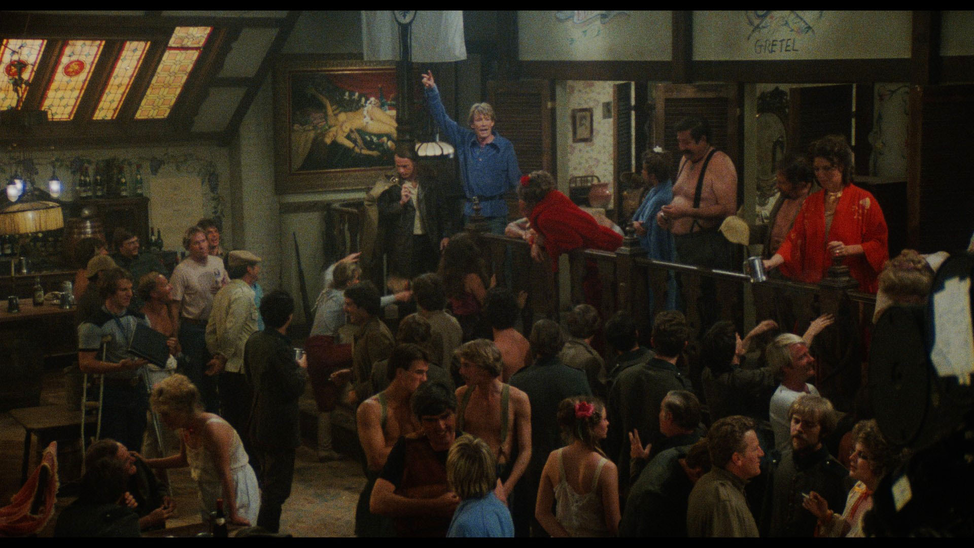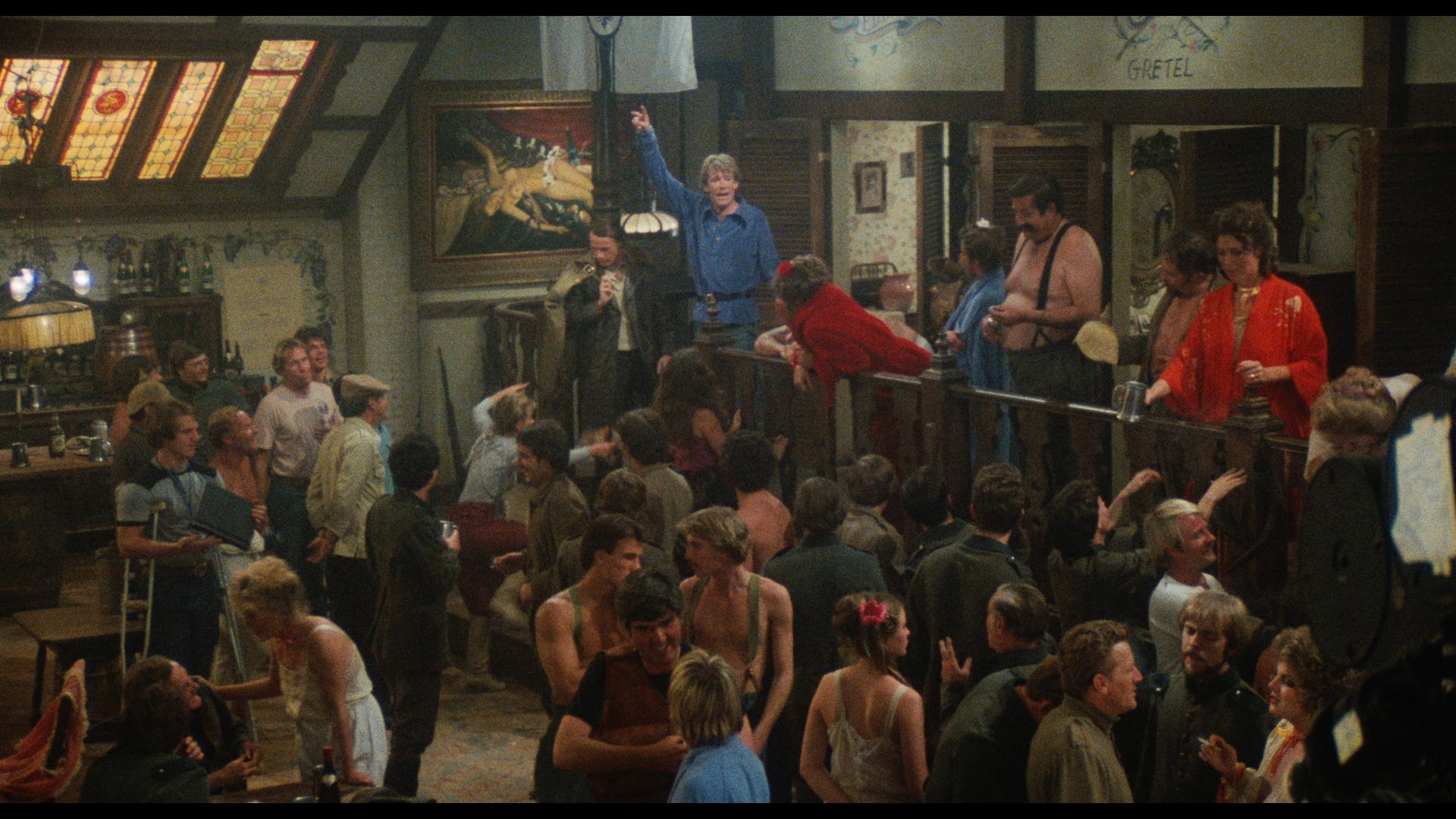 In 2026, Radiance Films sleeted The Stunt Man as the second release in its Transmission brand (following another 1980 film, Night of the Juggler) as an expanded UHD and Blu-ray region-free special edition. The new 4K scan from the original camera negative looks superb, retaining the inherent grittiness of the original cinematography while increasing detail and color fidelity with the UHD's HDR-compatible Dolby Vision grade looking especially rich. It also features a major amount of significant image info in the second half of the film, which was cropped to varying degrees in earlier releases (see comparison below). The DTS-HD MA 2.0 mono and 5.1 options both sound solid and come with optional English SDH subtitles. Ported over here are the original cast and crew commentary, Rush's intro, The Sinister Saga, the Rush intro, the New Beverly Q&A, the trailer, the deleted scenes, and the prior Blu-ray's Rush, O'Toole, Railsback-Rocco, and Hershey interviews. (It's a little jarring now to note that only two of them are still with us as of this writing.) A new audio commentary with critics Christina Newland and Monica Castillo does an enthusiastic job of parsing through the film's reality vs. illusion theme, the treatment of war trauma, the role of the score, the depictions of tyrannical film directors, and much more. Also new here is an interview with Bail (10m6s), shot before his death in 2020 for a documentary about Rush, chatting about his career as a stunt man, his memories of Rush and working in San Diego, and the working process of essentially playing himself as well as his favorite moments in the final result. The limited edition also comes with a pull-out poster, six lobby-card style postcards, and a 40-page book with new essays by Adam Nayman and Brandon Streussnig and an archival interview with Rush and Kenneth Turan.