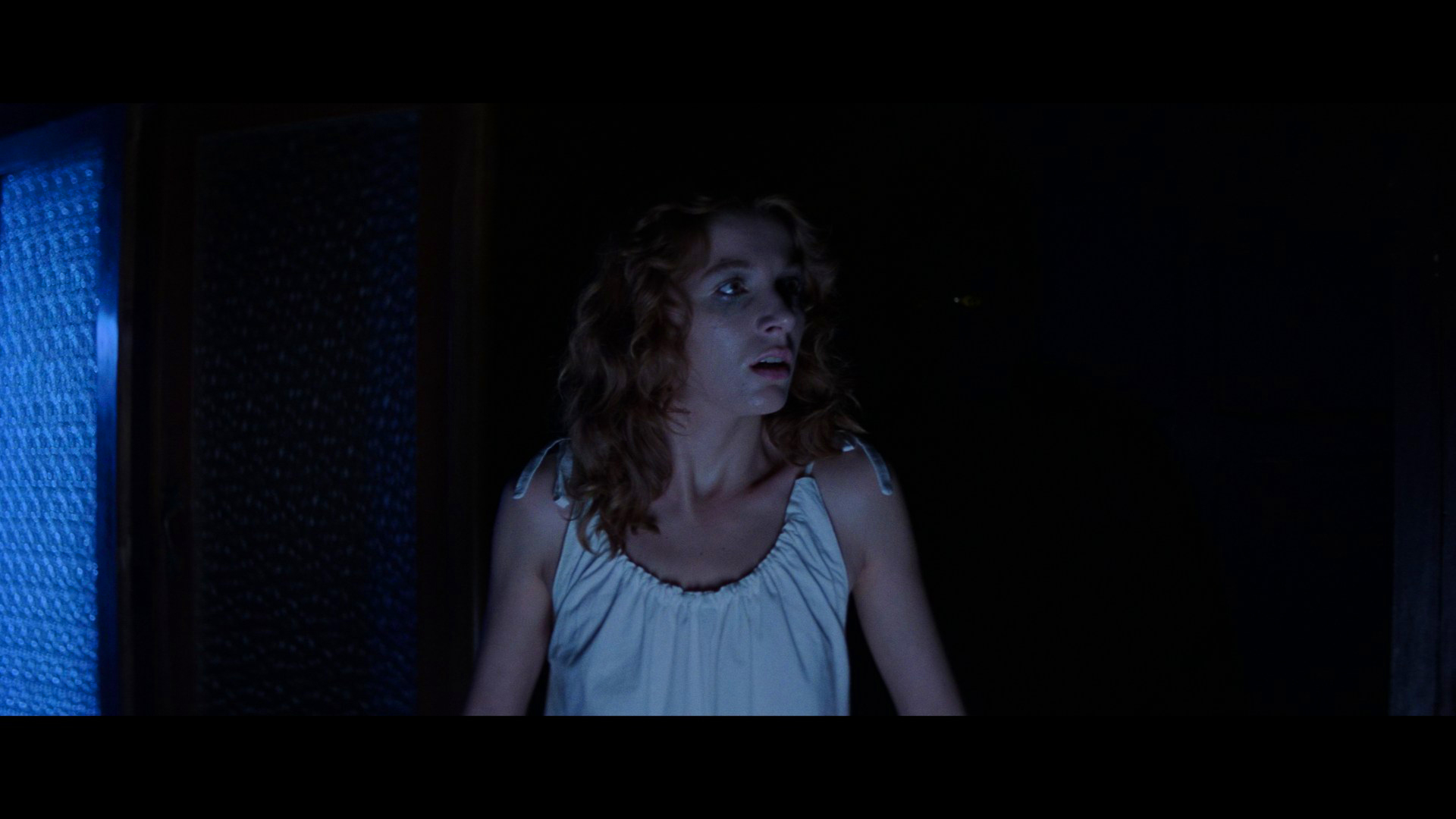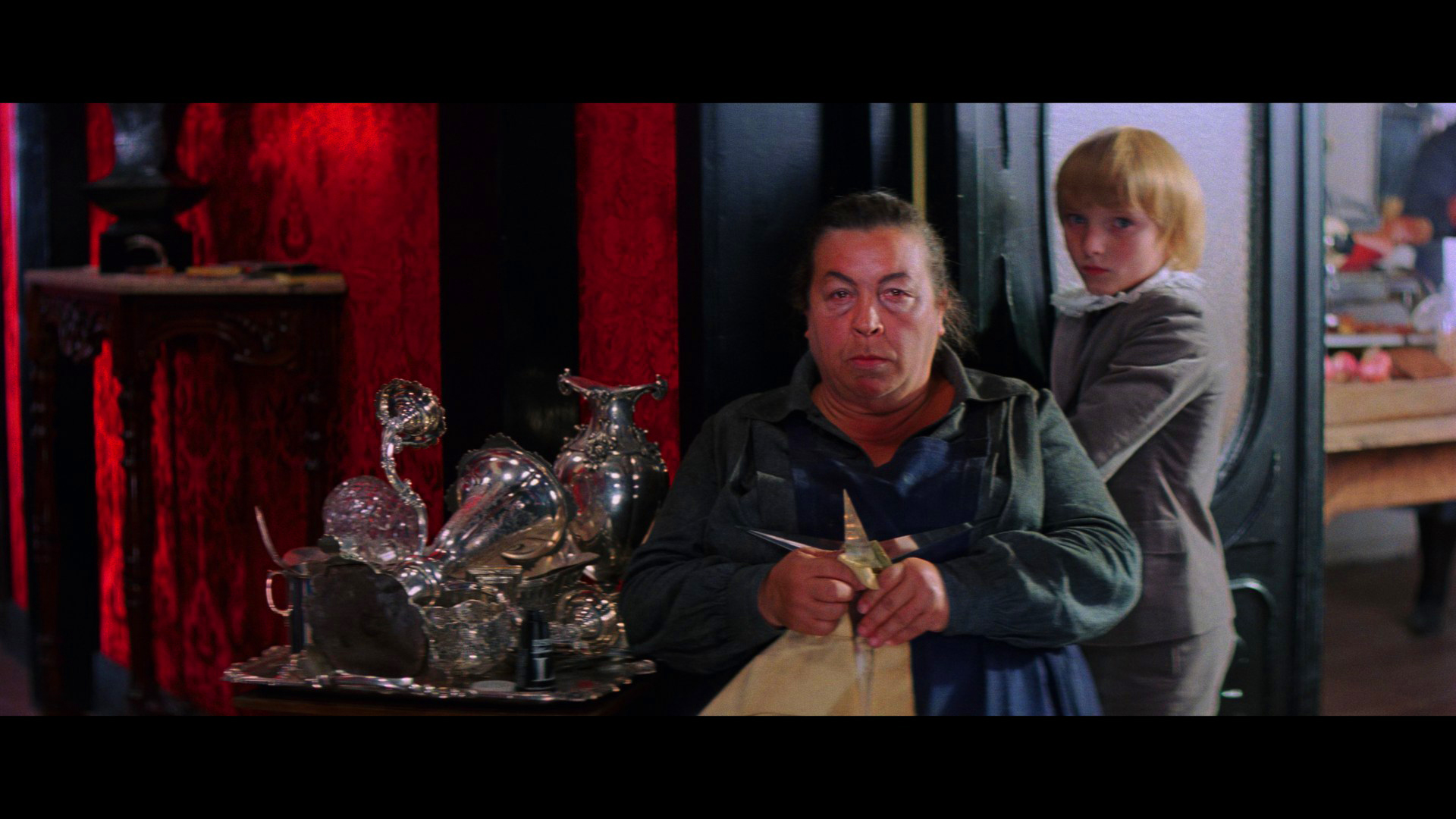 shouted statement at the front door during the rainstorm is now partially silent, making it impossible to make out her words even when one knows what she is saying; after Pat says "I'd like to dry off" at the beginning, the door slam behind her is now a soft thud instead of the earlier split-channel slam; the eyes glaring at Pat through the window are accompanied by a shorter, more muted sound effect stinger; the cries of "Help me" during the first murder have been reduced and are much softer; the growling heard inside the school hallway when Albert is attacked by the seeing eye dog is different and much more subdued; the whispering voices emanating during the beginning of Sarah's nocturnal pursuit through the building are not the same, and the sounds heard during the close up of the razor being removed are edited differently. On the other hand, when Suzy observes Madame Blanc and company undergo their witch ritual, Miss Tanner has a previously obscured line of dialogue when she leans forward: "She wouldn't eat or drink anything this evening." The thunder effects which occur in the same scene to coincide with the red flashes of light (as Blanc utters "Sickness! Sickness!") are now missing, too. Also oddly enough, the screaming voices heard over the end credits music are gone, leaving instead Goblin's frenzied middle movement of the main title theme. This release also marks the first availability of Suspiria with captions, and while this addition helps clarify a few lines of dialogue, it also contains quite a few errors and makes for hilarious reading when the captioner tries (and fails) to translate the Goblin music ("La la la la la la la -- Wait!"). The Italian audio is included but, since it can only be viewed with those captions, is pretty useless here.