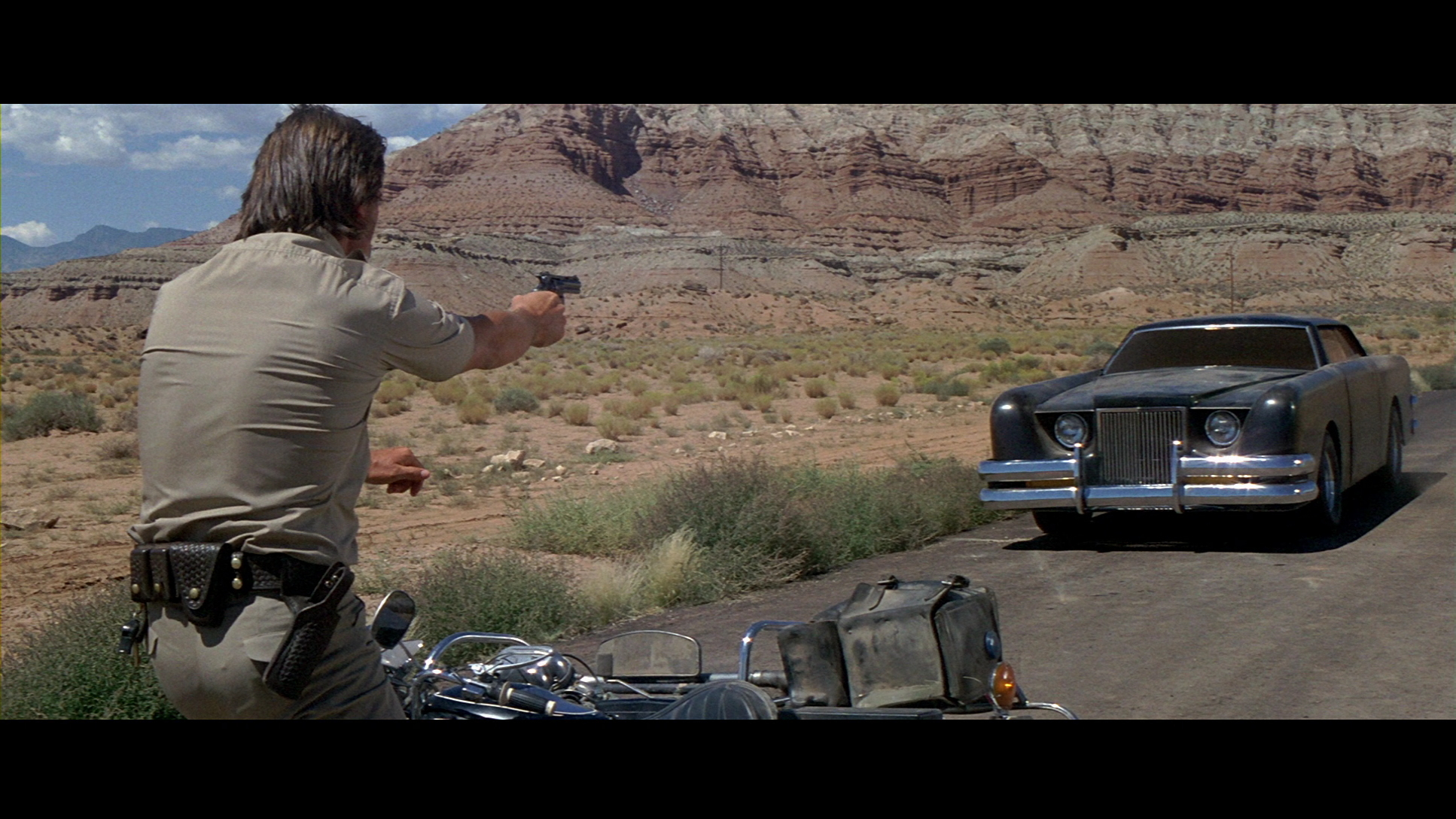 one of the film's greatest assets, combining crisp desert vistas with gleaming, menacing shots of the car careening through dusty highways; it's an unusual way to design a horror film, but it certainly sticks in your memory.