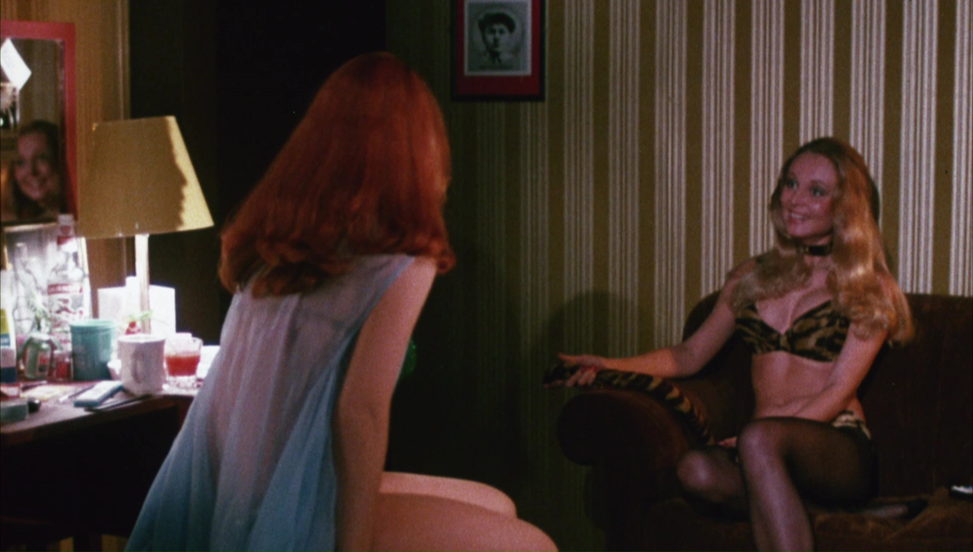 Like Rothman's other films from this period, The Working Girls hit VHS most widely in an oversized box from Continental Video (with the big strip scene recycled for the popular The Best of Sex and Violence compilation) but went out of circulation before Elvira's popularity reached its crescendo. It was maddeningly difficult to find for many years, at least until Code Red finally issued a DVD in 2011 and a Blu-ray in 2016, the latter sporting a fresh HD scan "supervised by director Stephanie Rothman from her private UCLA archival print," which means it features great colors and detail but its fair share of specks and scuffs at times. In either format this will likely be a first-time viewing opportunity for drive-in film fans too young to remember top-loading VCRs. The widescreen framing corrects the distracting open matte dead space that made it look like a deranged episode of Three's Company in prior editions, making this a respectable option for anyone interested in the reclusive Rothman; hopefully someday she'll at least write her memoirs or preserve her memories of her directing days for posterity in some permanent fashion. The only relevant extras here are the theatrical trailer and a darkly lit 12-minute interview with the busty Rose in full burlesque gear.